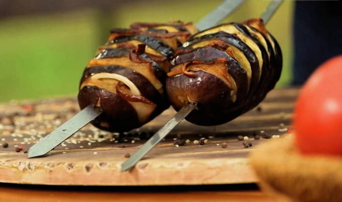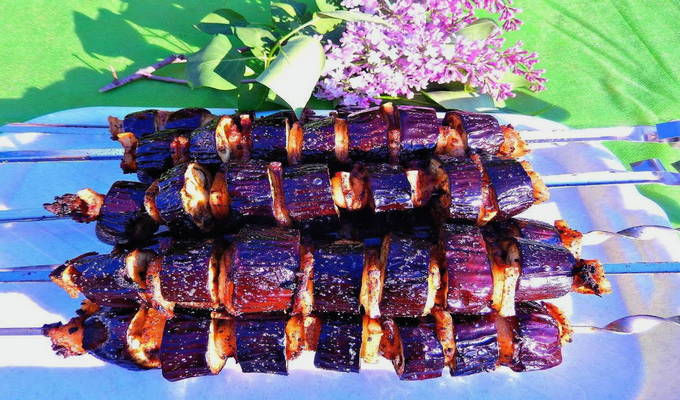 Aubergines op spiesjes met spek blijken mals en sappig te zijn, het spekvet laat ze niet uitdrogen in het vuur en voegt een aangename toon van gerookt vlees toe aan groenten. Paprika voegt een aangenaam aroma en heldere smaaknuance toe.