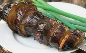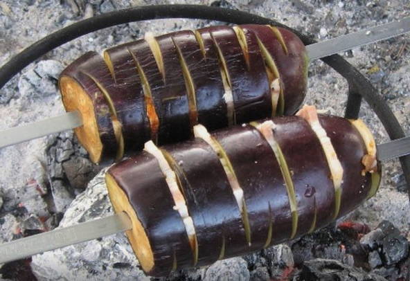 - Leg de aubergines op spiesjes en gril ze 15-20 minuten boven houtskool, waarbij ze aan alle kanten gelijkmatig bruin worden. Serveer met lichte saus en kruiden.