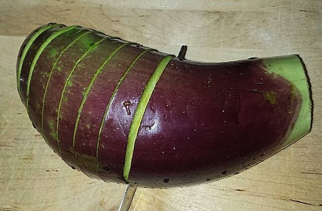 - Was de aubergines en snijd ze in een accordeon, zonder tot het einde door te snijden.