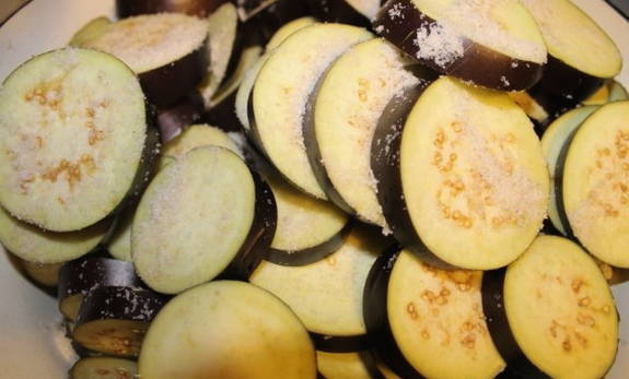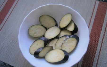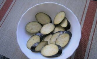 We wassen de aubergine, snijden hem in cirkels van gelijke dikte. We vullen ze met zout, roeren en laten 15 minuten staan.