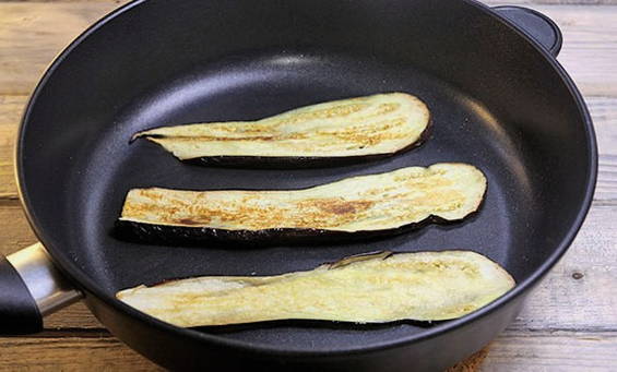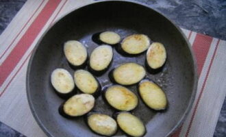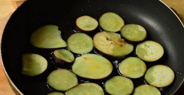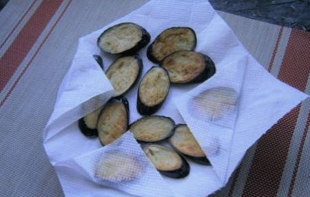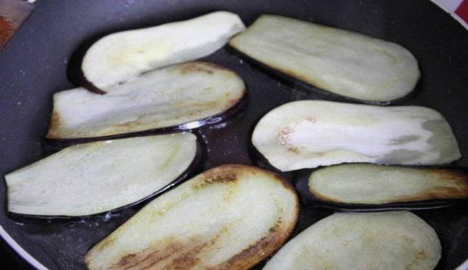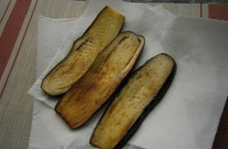 - Bak de stukjes in plantaardige olie tot ze zacht zijn. Als je klaar bent, leg je de aubergines op het papier zodat het het vet opneemt.