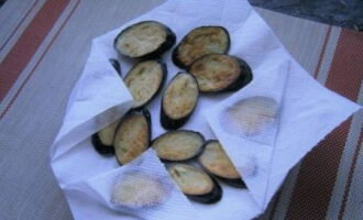 Dep de aubergines na het frituren met keukenpapier om overtollige olie te verwijderen.