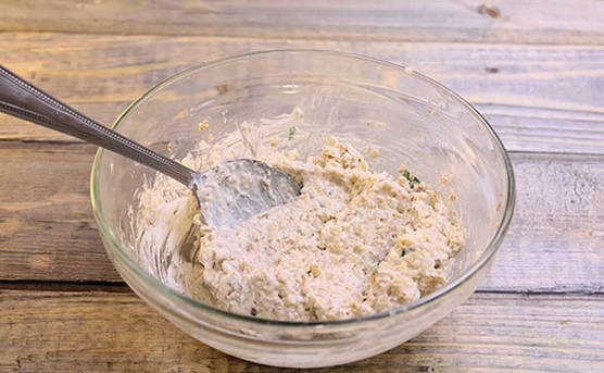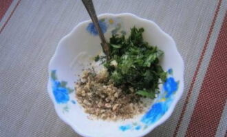 - Meng in een gemeenschappelijk bord het notenmengsel, de gehakte peterselie en de zure room. Roer tot een gladde massa.