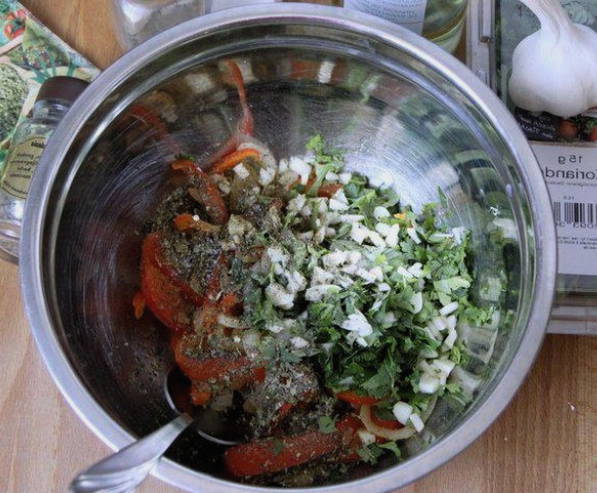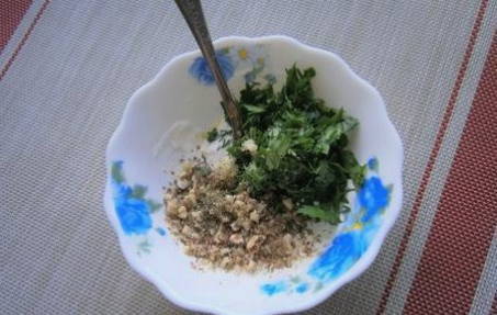 - Voeg peper en uien toe met gehakte knoflook en basilicum. Giet gemalen peper, hop-suneli hier, giet er een hapje in. Kneed de massa.