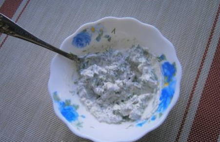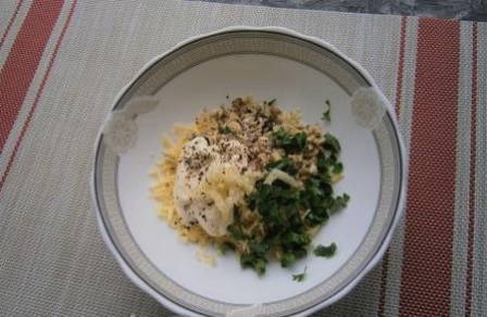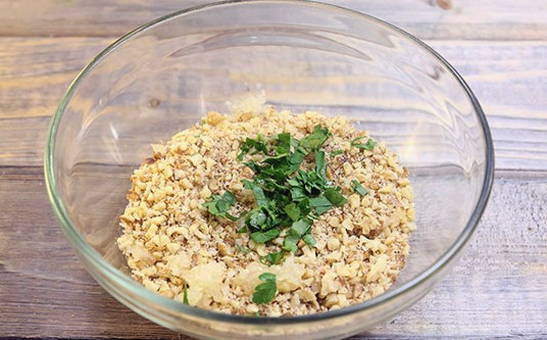 - We wrijven harde kaas, mengen het met gehakte noten, kruiden en knoflook.