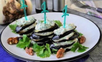 Aubergines in Georgische stijl met noten zijn klaar. Leg ze op een bord en serveer.