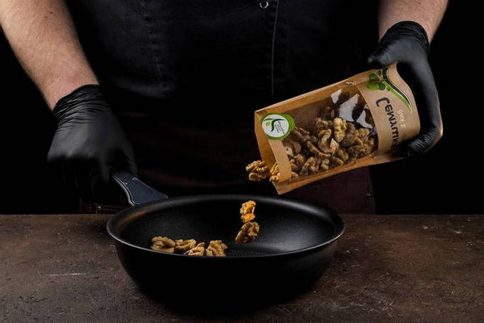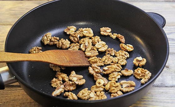 - Schil de walnoten en bak ze 1-2 minuten in een pan.