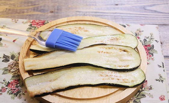 - Bestrijk de auberginereepjes met plantaardige olie.