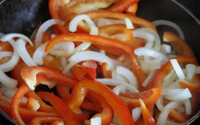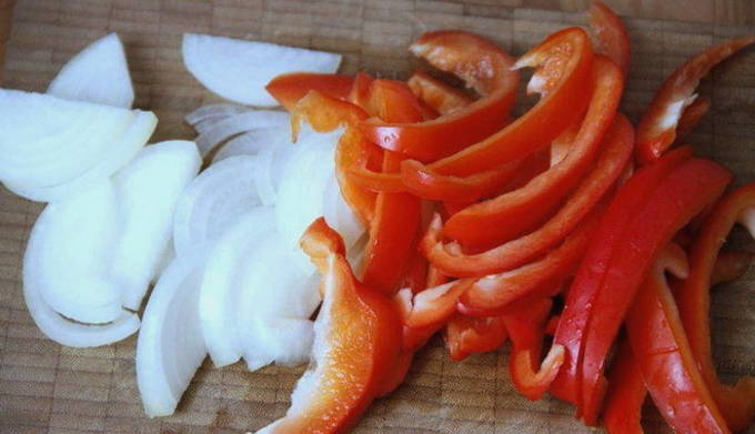 - Snijd de paprika in dunne reepjes en de uien in halve ringen.