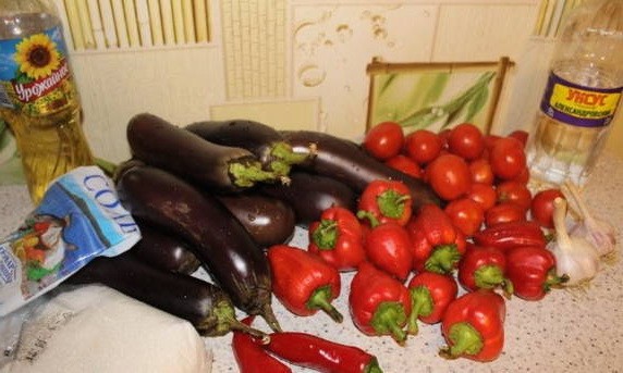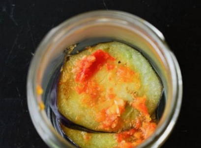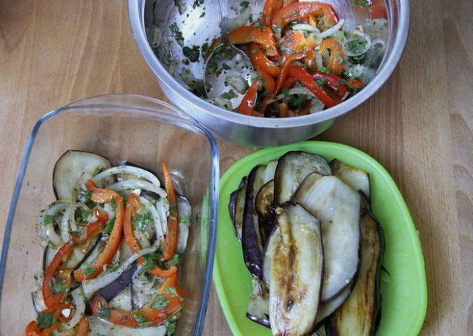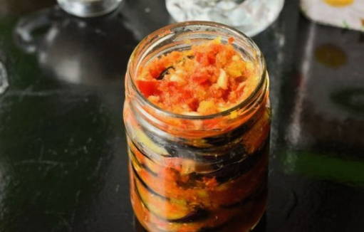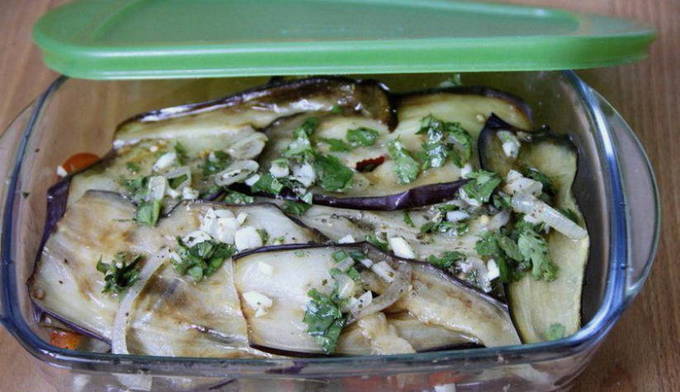 - Verdeel de gebakken aubergines geleidelijk. We bedekken het product met een gehakte massa paprika, suiker en azijn.