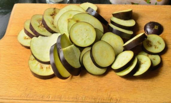 - Daarna snijden we de aubergines in cirkels van gelijke dikte.