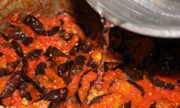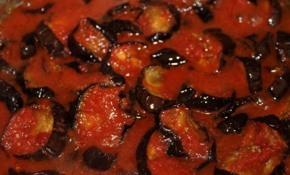 - Dompel de gebakken aubergine onder in het hete mengsel. Laat 5-10 minuten op laag vuur sudderen.