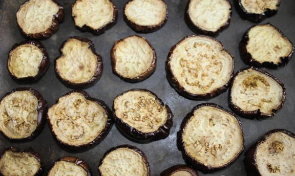 - Weer terug naar aubergine. We bakken ze 20 minuten in een op 200 graden voorverwarmde oven.