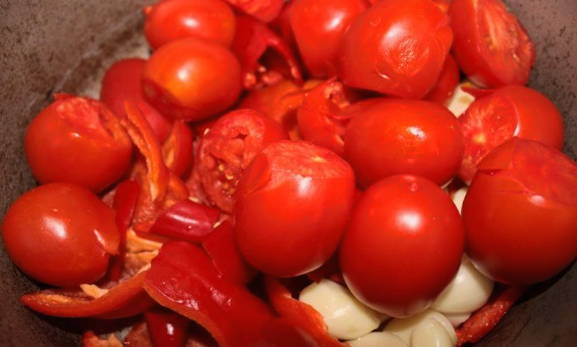 - Doe de tomaten en de gepelde paprika in een pan. Ook leggen we hier gepelde knoflookteentjes.