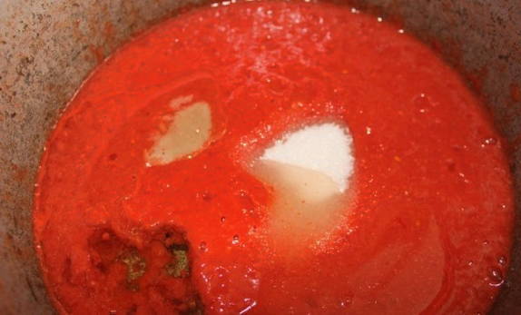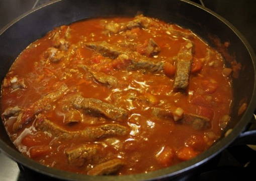- Nadat de massa is gekookt, doe je het vlees erin. Zout en peper de inhoud, laat ongeveer 30 minuten sudderen.