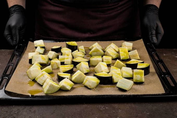 - Vervolgens verdelen we de groente in middelgrote stukken. We verspreiden ze op een bakplaat met perkament, gieten met olijfolie en bakken gedurende 15 minuten op een temperatuur van 200 graden.