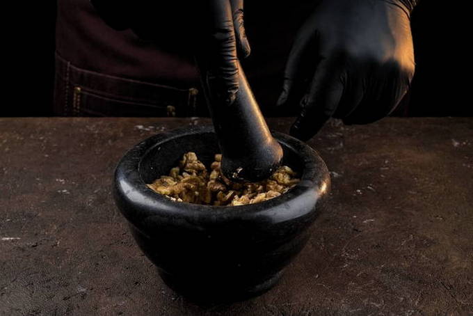 We vullen de massa aan met gemalen walnoten, wisselende kruiden en droge specerijen.