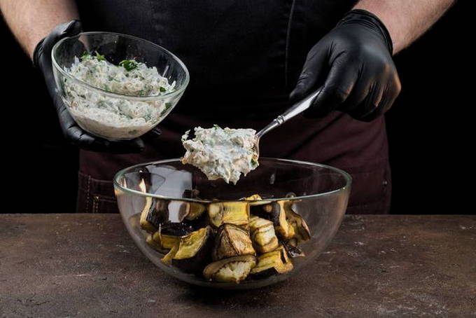 - Bestrooi de gebakken aubergines met zout en gemalen zwarte peper. We verspreiden de dressing over de groente. Roeren.
