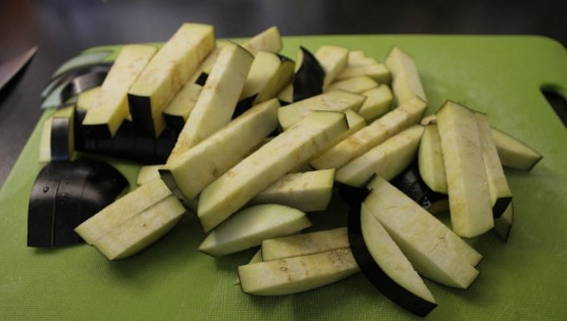 - We wassen de aubergines en verdelen ze in dunne reepjes.