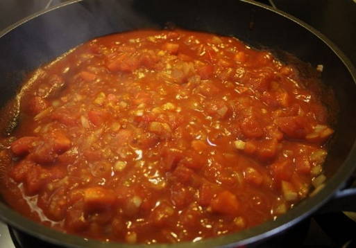 - Leg hier fijngehakte tomaten, giet tomatenpuree erin.