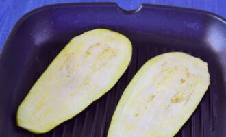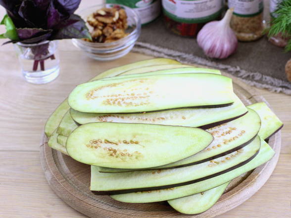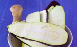 - Was de aubergines, droog ze, snijd ze in dunne reepjes en bak ze aan beide kanten in plantaardige olie.