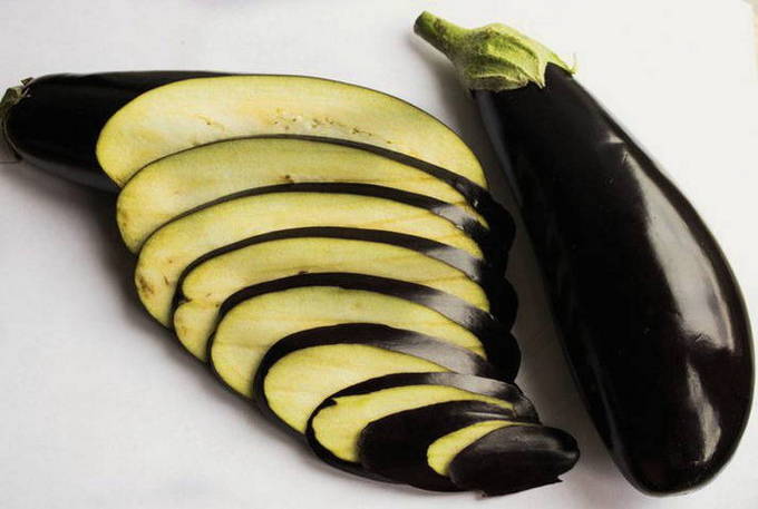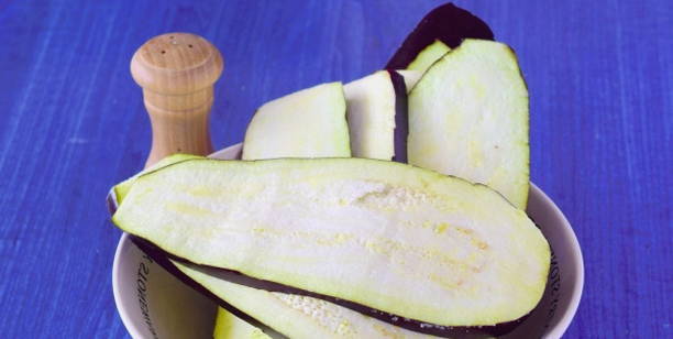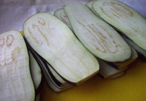 - Was de aubergines, droog ze en snijd ze in dunne plakjes. Bestrooi de aubergines met zout en laat een half uur staan, gedurende welke tijd alle bitterheid uit de groente zal komen.