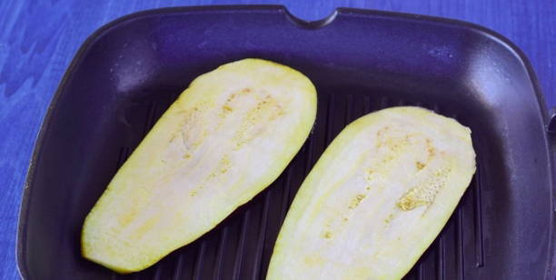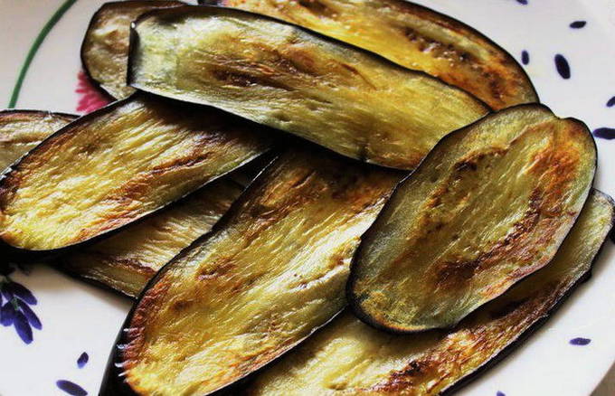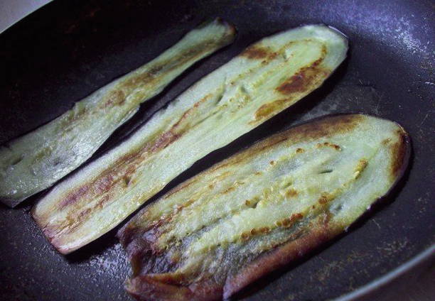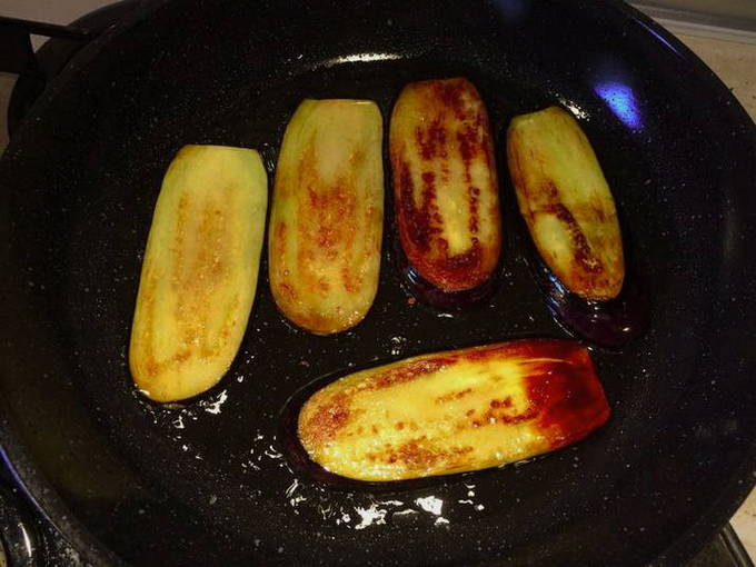 - Spoel de aubergines vervolgens af met water, droog ze en bak ze aan beide kanten in plantaardige olie.