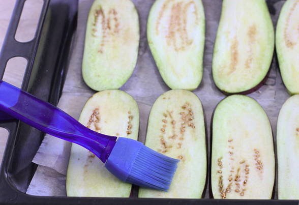 - Vet de aubergines in met plantaardige olie en leg ze op een bakplaat.