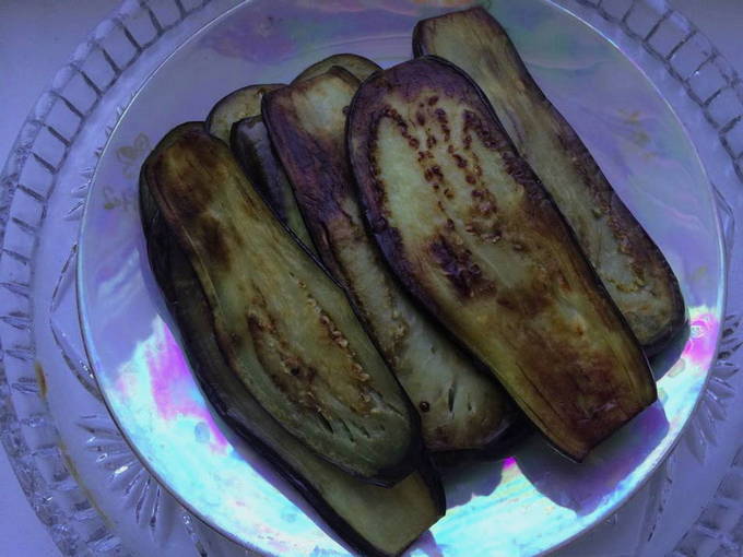 - Leg de gebakken aubergines op keukenpapier om overtollige olie te verwijderen.