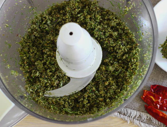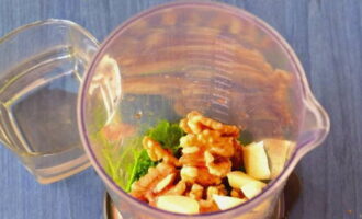 Doe de noten, peterselie, koriander, knoflookteentjes, suneli-hop in een blenderkom en giet er een paar eetlepels water bij. Maal de ingrediënten tot een gladde pasta.