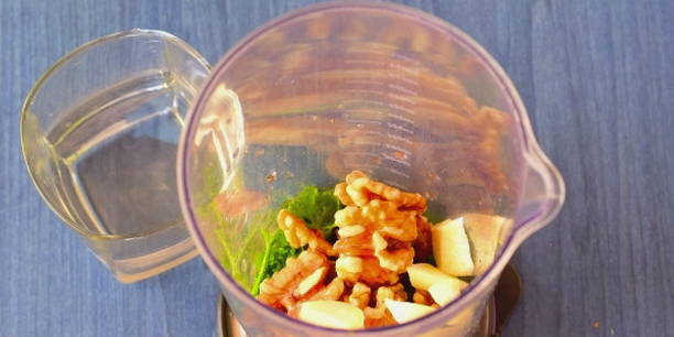 - Doe walnoten, kruiden, knoflook, zout naar smaak en kruiden in een blenderkom.