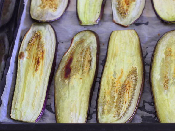 - Bak de aubergines 15-20 minuten in de oven op 200 graden.