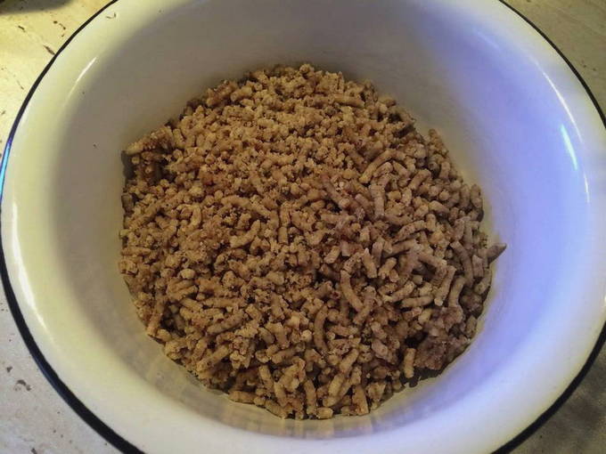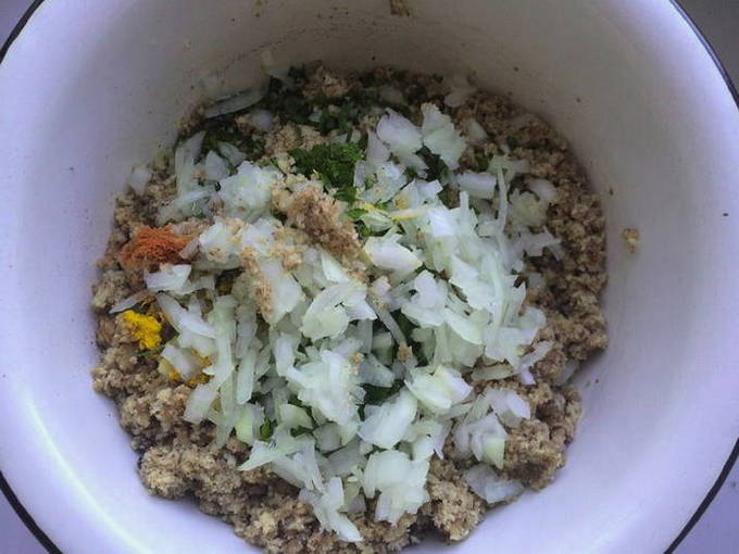 - Wrijf de walnoten, knoflook en kruiden door een vleesmolen.