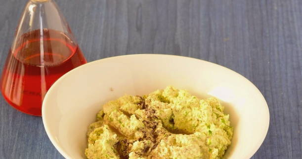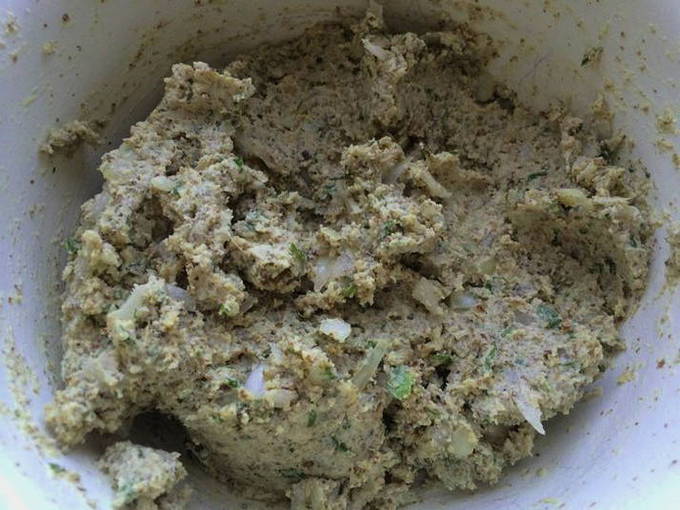 - Hak de uien en het groen zeer fijn, meng met de notenmassa, voeg wijnazijn toe.