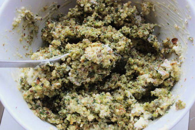 - Combineer kaas, noten, gehakte kruiden en knoflook. Voeg mayonaise en zout naar smaak toe, roer.