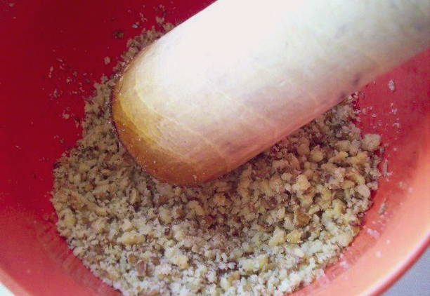 - Maal de ingrediënten tot ze fijn verkruimeld zijn. Voeg een paar eetlepels water toe om het gladder te maken.