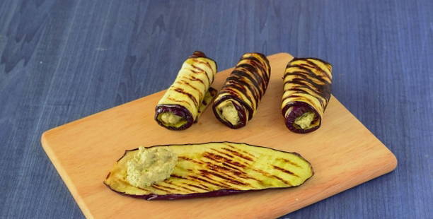 - Aubergine- en notenrolletjes zien er heel origineel uit op tafel.