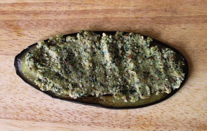 - Leg de notenvulling op de gebakken aubergines, wikkel de broodjes.