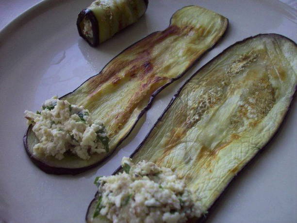 - Doe wat notenvulling op het ene uiteinde van de auberginereepjes, wikkel de broodjes.