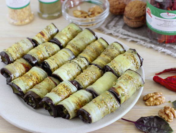 Auberginerolletjes gevuld met walnoten en koriander zijn een geweldig aperitief voor een verscheidenheid aan feestelijke en alledaagse menu's. Het past goed bij wijn en verschillende soorten kazen.