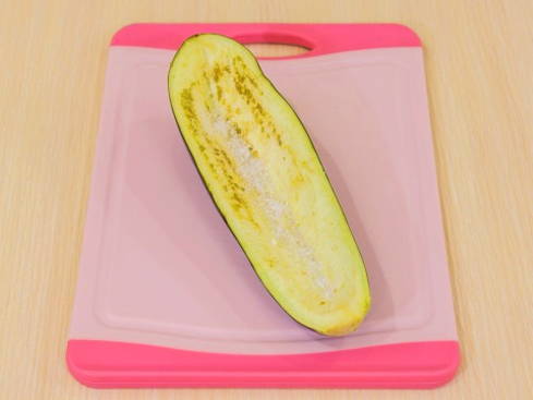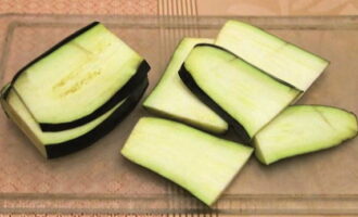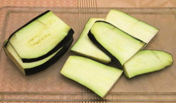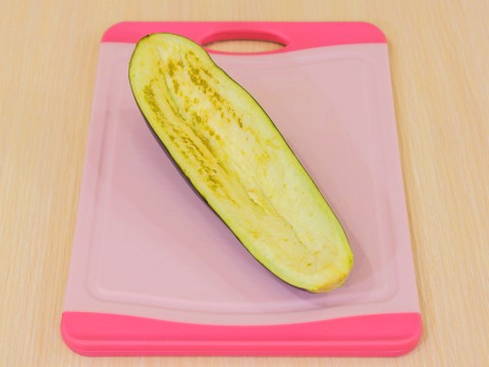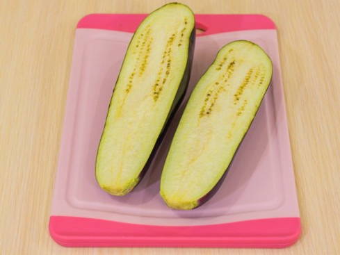 - We wassen de aubergines, verwijderen de stelen en snijden ze in twee lange delen.
