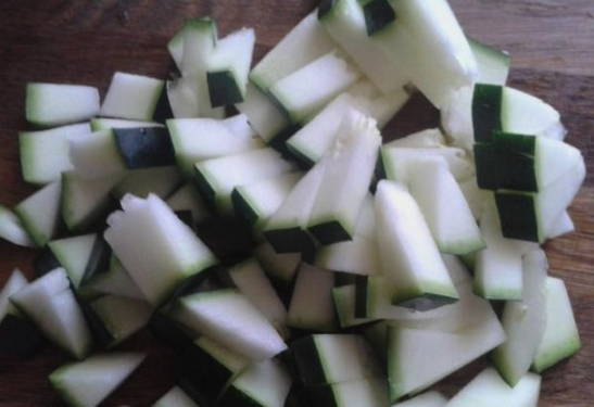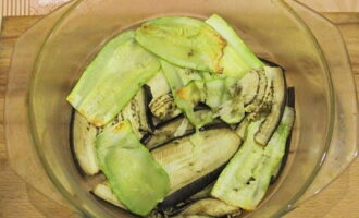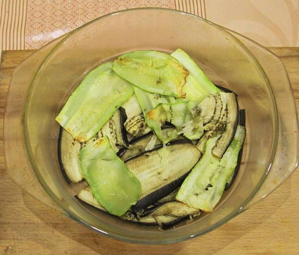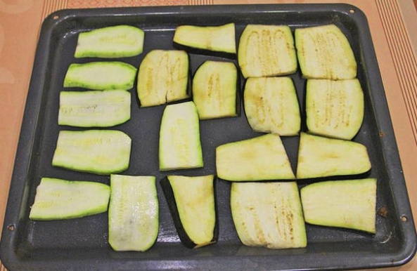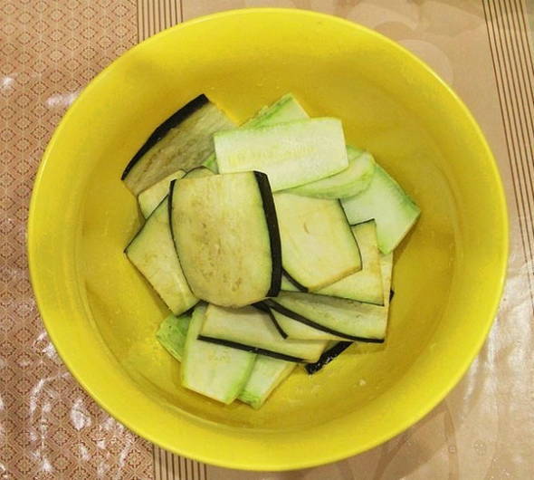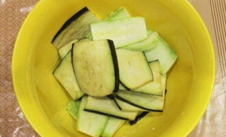 Spoel de aubergines goed af met courgette. Snijd groenten in dunne plakjes. Het is niet nodig om jonge vruchten te pellen.