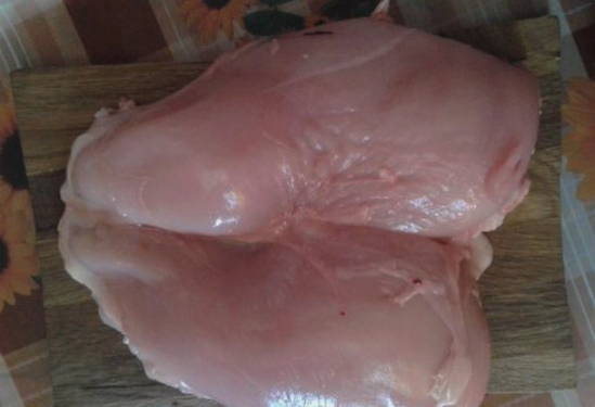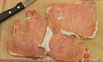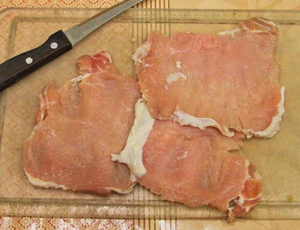 Ook het ontdooide vlees snijden we in dunne plakjes. Ze kunnen worden afgeslagen.