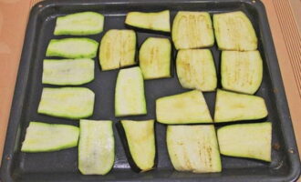 Leg de aubergine en courgette op een ingevette bakplaat. We bakken het product 10 minuten op een temperatuur van 200 graden.