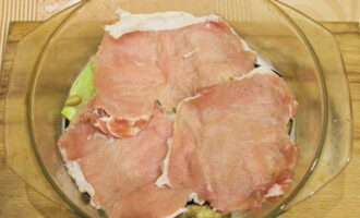 Vervolgens leggen we het vlees. Bestrooi het met zwarte peper.