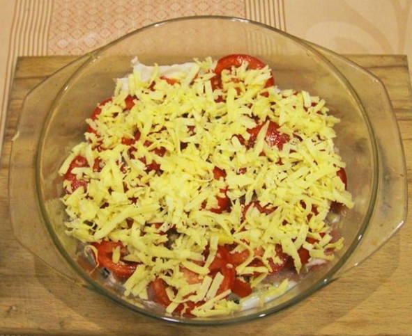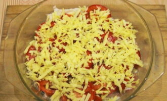 Leg vervolgens dunne plakjes tomaten, bestrooi ze met geraspte kaas.