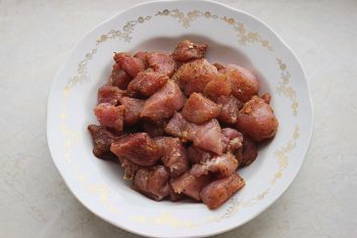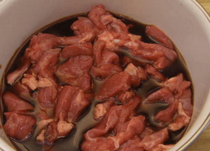- Snijd het varkensvlees in dunne reepjes, voeg het eiwit en de halve sojasaus toe. Roer en laat 15 minuten marineren.
