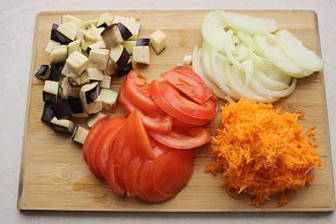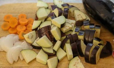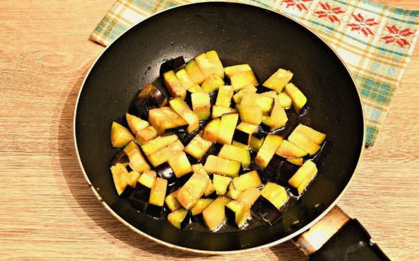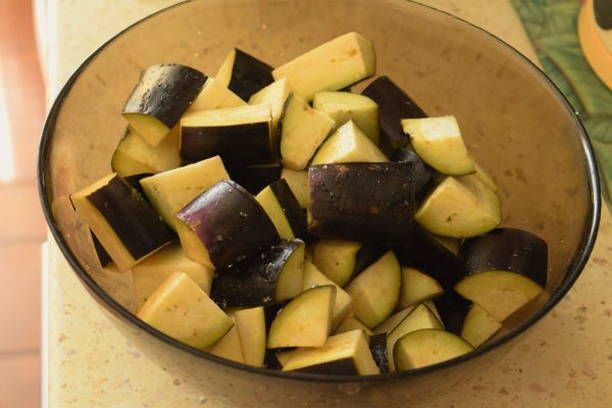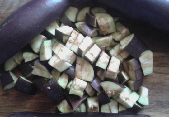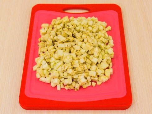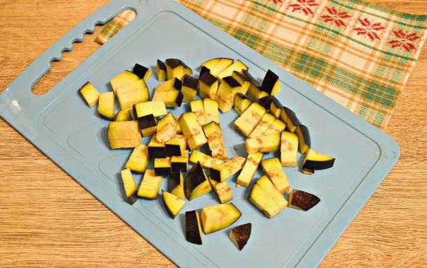 - Spoel de aubergine grondig, verwijder de steel. Snijd de groente vervolgens in kleine blokjes.