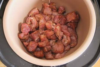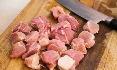 - Ontdooi en spoel het vlees en snijd het in kleine stukjes.