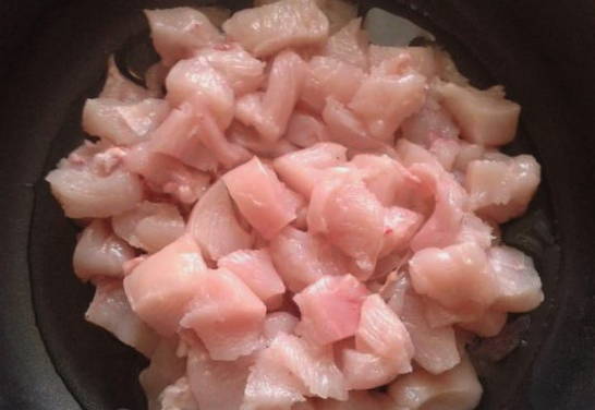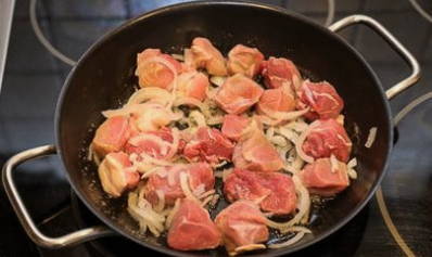- Leg vervolgens kleine stukjes varkensvlees. We koken ongeveer 5 minuten.